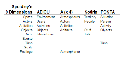 Each framework attempts to recreate a similar result with perhaps the major differences being that Spradley's framework encourages you to divide up the world more explicitly into smaller categories, and that each of the others AEIOU, POSTA, POEMS and A(x4) have catchy names and a smaller number of categories allowing you to remember them all.